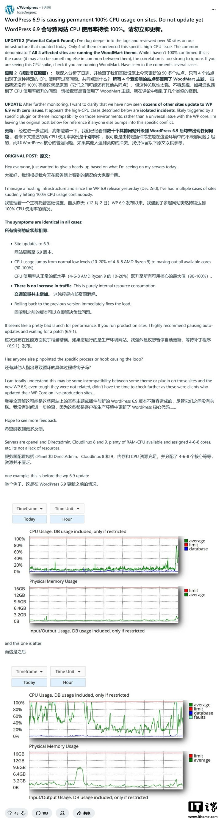 除加载延迟外,Reddit社区也曝出了更为激进的资源占用问题。一位管理托管基础设施的用户指出,自WordPress6.9发布以来,多个站点突然出现CPU使用率持续锁定在100%的情况。IT之家附上相关截图如下: