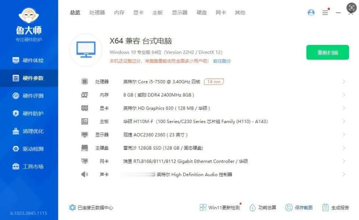 于是,老田给电脑接电,装了个娱乐大师,上面这样一张配置图就出来了。