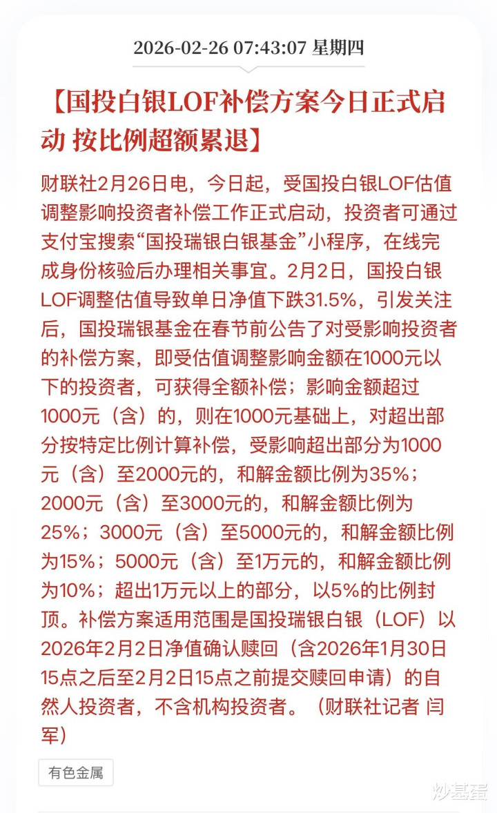 补偿方案适用范围是国投瑞银白银(LOF)以2026年2月2日净值确认赎回(含2026年1月30日15点之后至2月2日15点之前提交赎回申请)的自然人投资者,不含机构投资者。
