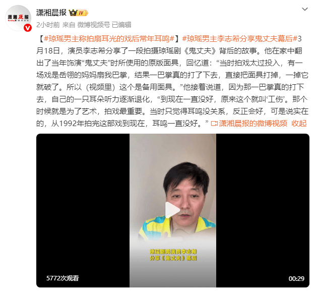 3月18日,演员李志希分享了一段拍摄琼瑶剧《鬼丈夫》背后的故事。他在家中翻出了当年饰演“鬼丈夫”时所使用的原版面具,回忆道:“当时拍戏太过投入,有一场戏是岳翎的妈妈扇我巴掌,结果一巴掌真的打了下去,直接把面具打掉,一掉它就破了。所以(视频里)这个是备用面具。”他接着说道,因为那一巴掌真的打下去,自己的一只耳朵听力逐渐退化,“到现在一直没好,原来这个就叫‘工伤’。那个时候就是为了艺术,拍戏最重要。当时只觉得耳鸣没关系,反正会好,可是说实在的,从1992年拍完这部戏到现在,耳鸣一直没好。”